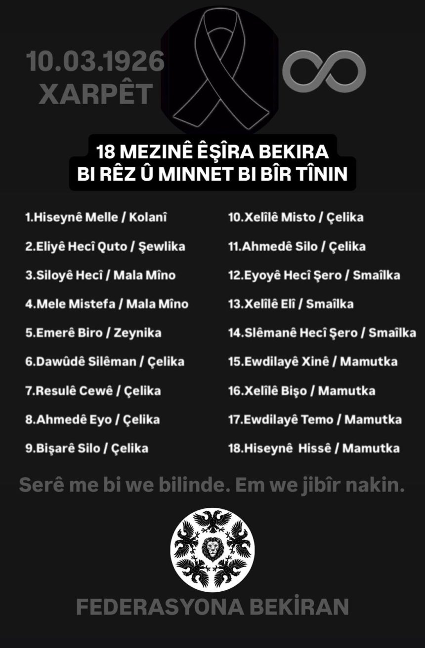 Tarihî Anma Yazısı 10 Mart 1926 – Xarpêt’te İdam Edilen 18 Bekiranlı Bekiran aşiretinin hafızasında derin iz bırakan bu acı…